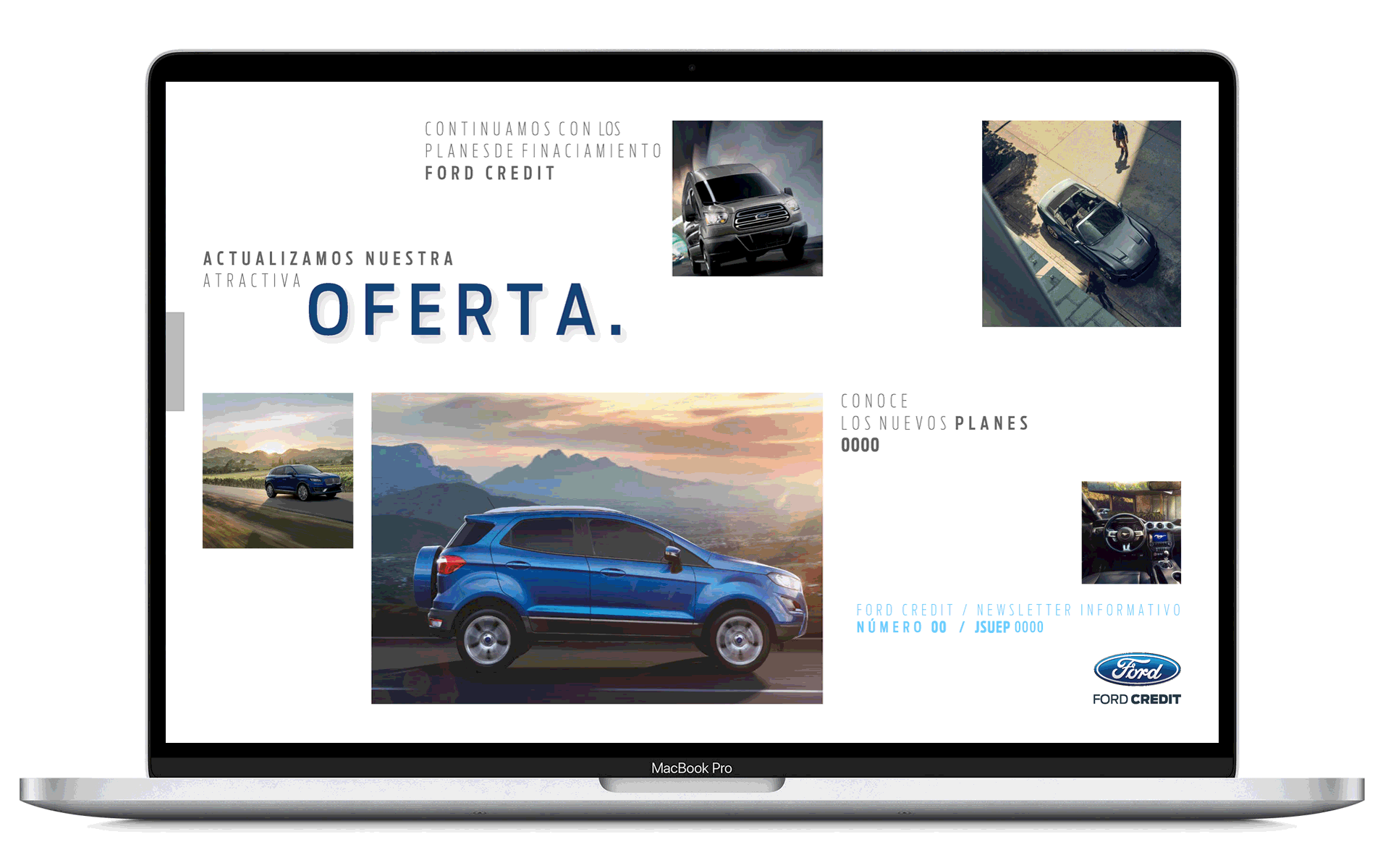 Tenemos ya 4 años desarrollando este proyecto y el reto radica en organizar toda la información sin perder de vista los guidelines de Ford. Esta es una revista digital mensual que muestra la oferta y programas de Ford Credit.